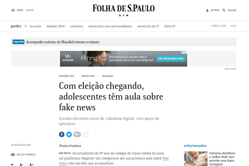 Em maio, o Jornal da Band foi até o colégio Magister para abordar o tema e o uso da disciplina “Educação Digital” em sala de aula, tratando a educação como a única solução no combate à disseminação de notícias falsas. Veja o vídeo abaixo (se preferir, clique aqui):