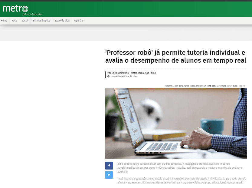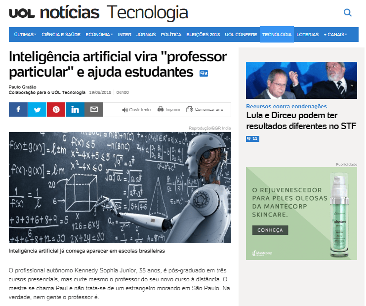 - Inteligência artificial: Ainda em maio, o jornal publicou uma matéria sobre como a inteligência artificial é trazida pelo Geekie One em colégios como o Mater Dei. Leia aqui.